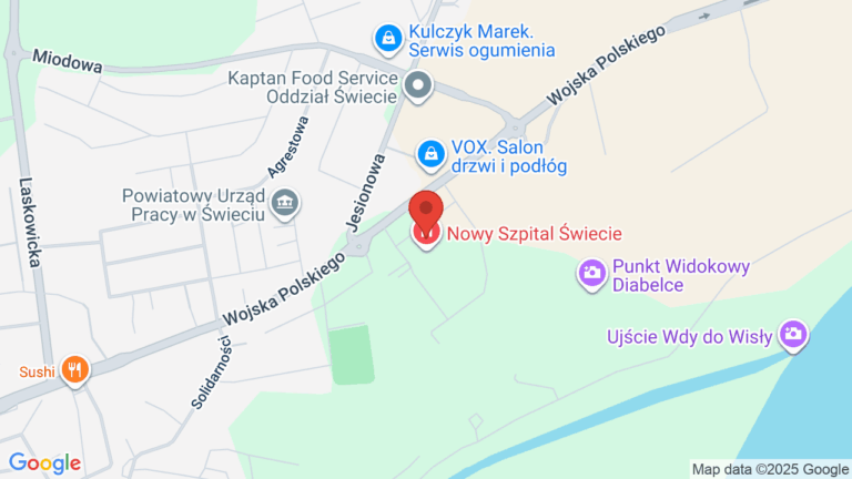 Nowy Szpital znajduje się w Świeciu i oferuje badania takie jak rezonans magnetyczny oraz tomografia komputerowa. Placówka dysponuje udogodnieniami, takimi jak toaleta, parking, podjazd oraz winda, co zwiększa komfort pacjentów.