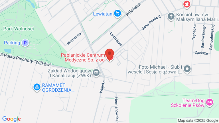 Pabianickie Centrum Medyczne znajduje się w Pabianicach. Placówka oferuje badania takie jak pierwsza wizyta u onkologa oraz tomografia komputerowa. Umożliwia również korzystanie z udogodnień, takich jak toaleta, parking, podjazd i winda.