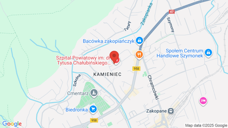 Szpital Powiatowy im. dr Tytusa Chałubińskiego w Zakopanem oferuje usługi medyczne, w tym pierwszą wizytę u onkologa oraz tomografię komputerową. Placówka jest wyposażona w udogodnienia, takie jak toalety i windy, co zapewnia komfort pacjentom. Znajduje się przy ulicy Kamieniec 10 i jest dostępna dla osób z ograniczoną mobilnością.