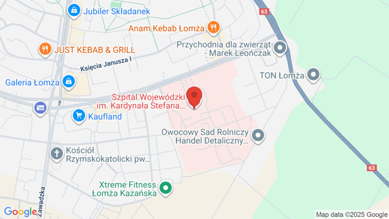 Szpital Wojewódzki im. Kardynała Stefana Wyszyńskiego w Łomży oferuje szeroki zakres usług medycznych, w tym pierwszą wizytę u onkologa, rezonans magnetyczny oraz tomografię komputerową. Placówka jest wyposażona w udogodnienia, takie jak toaleta, podjazd oraz winda, co zwiększa komfort pacjentów. Szpital znajduje się przy ulicy Marszałka Józefa Piłsudskiego 11.
